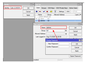 The administrator configuration aims to set a password for accessing the administrator window on WinBox to prevent unrestricted access. The identity of the router and administrator can be changed using the WinBox facility in the System > Identity tab to set the Router Identity, and System > users to change the login user and set the router password when logging into WinBox.