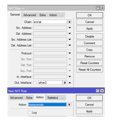 To configure the NAT firewall rule using the src-address parameter. The rule used is chain=srcnat out-interface=ether2, then in the action menu select Masquerade. Configuration can be done using Winbox through the menu IP > Firewall> NAT tab. As shown in the image below: