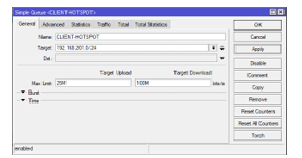 In the Simple Queues menu on Mikrotik, click Add (+) to create a new queue. In the General tab, provide a queue name as needed, for example, Name = CLIENT-HOTSPOT, then specify the Target by entering the IP address or network to be limited, such as 192.168.201.0/24. Next, set the Max Limit to establish upload and download speed limits, for example, 25M/100M. After all settings are completed, click Apply to apply the configuration and OK to save it.