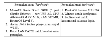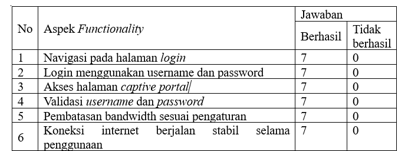 The MikroTik RouterBoard 50UG device acts as a gateway and also as a hotspot server that manages the authentication process, bandwidth settings, and access restrictions. This is in line with the opinion.[7] which states that logging on public networks is important to detect and prevent illegal activities. As a final stage, system testing was carried out using the Blackbox Testing method to ensure that all functions operate according to the design. This method is considered appropriate because it focuses on testing the output of the system based on the input without looking at the internal code, as explained by that Blackbox Testing is effective for testing system functionality from the user's perspective.