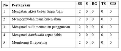 The testing phase was conducted for the network managers at Café Lilnook using a questionnaire containing several indicator questions from the usability aspect of the authentication login security design for the hotspot at Café Lilnook. The results of the product testing were implemented in the questionnaire that was distributed, and the following scores were obtained: