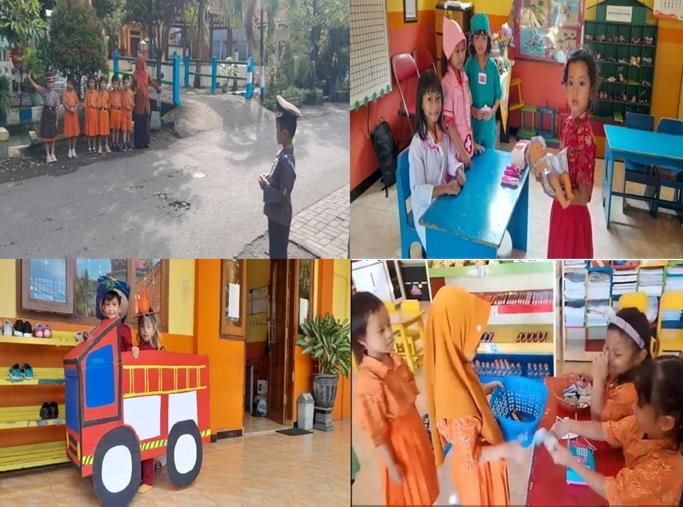 Tema guru dan murid melatih anak untuk memimpin, berbicara di depan teman, dan belajar mengatur peran dalam kelompok. Anak yang berperan sebagai guru menunjukkan perhatian kepada “murid”-nya, sementara anak yang berperan sebagai murid belajar menghargai instruksi. Hal ini membantu menyeimbangkan sifat kepemimpinan dan kerja sama. Pada tema profesi di bidang kesehatan, guru memfasilitasi anak memerankan dokter, perawat, apoteker, dan pasien. Anak yang biasanya pendiam menjadi lebih percaya diri saat menjelaskan “gejala” pasien kepada dokter, sedangkan anak yang memerankan dokter belajar menghibur pasien. Kegiatan ini menumbuhkan empati dan rasa tanggung jawab. Tema petugas pemadam kebakaran melatih anak untuk bekerja sama dalam memadamkan “api” dan menyelamatkan “korban”. Anak belajar mengatur strategi, mengambil keputusan cepat, dan berkoordinasi dengan teman, sehingga mengasah keterampilan kerja sama dan kontrol diri. Tema kasir dan pembeli melatih anak mengendalikan emosi saat menunggu giliran, bersikap sopan saat bertransaksi, dan menghargai peran sosial. Guru mengarahkan agar anak mengucapkan terima kasih setelah berinteraksi, sehingga membiasakan perilaku positif.