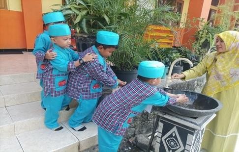 - Antri saat mencuci tangan, Anak diminta menunggu giliran saat mencuci tangan sebelum makan atau setelah bermain. Dalam kegiatan ini, anak belajar menahan diri, bersabar, dan menghormati giliran teman. Mengenali bahwa orang lain juga memiliki kebutuhan yang sama.