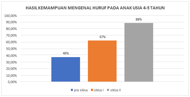Berdasarkan data yang diperoleh pada siklus II, terlihat adanya peningkatan dan perkembangan yang signifikan terhadap kemampuan anak usia 4-5 tahun dalam mengenal huruf setelah melakukan tindakan siklus II yakni mencapai 88%, dan jika dibandingkan dengan dua tindakan sebelumnya pra siklus dengan hasil 46% dan siklus I 67% jelas adanya perbedaan dan peningkatan di setiap pertemuan. Ini menunjukkan bahwa dengan tingkat keberhasilan yang dicapai senilai 88% pada tindakan siklus II ini dapat dikatakan berhasil karena sudah mencapai bahkan melampaui target yakni 75%. Berikut hasil keseluruhan dari pra siklus, siklus I dan siklus II :