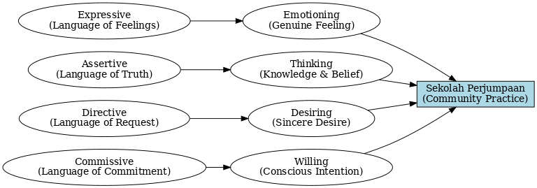 Second, alternative community-based models such as Freirean pedagogy in Latin America or Kominkan in Japan redirect attention from individual achievement toward collective empowerment. Their core approach is dialogical, centering on critical consciousness and participatory initiatives as means of liberating marginalized groups. In this paradigm, language is reconceived as an instrument of awareness and emancipation, allowing oppressed communities to identify and transform their lived realities. In contrast, the Sekolah Perjumpaan model advances a new framework in which the quality of social encounters becomes the primary site of change. Here, language is not treated merely as a medium or tool but as the very essence of moral practice, enacted through the alignment of intentional states (thinking, feeling, desiring, willing) with speech acts (assertive, expressive, directive, commissive). The expected outcome is not merely academic success or community empowerment, but the rehabilitation of social systems and normalisation of human relations. This integrative approach positions Sekolah Perjumpaan as a state-of-the-art model that complements Western traditions of pedagogy with a praxis deeply rooted in Indonesian socio-cultural contexts.