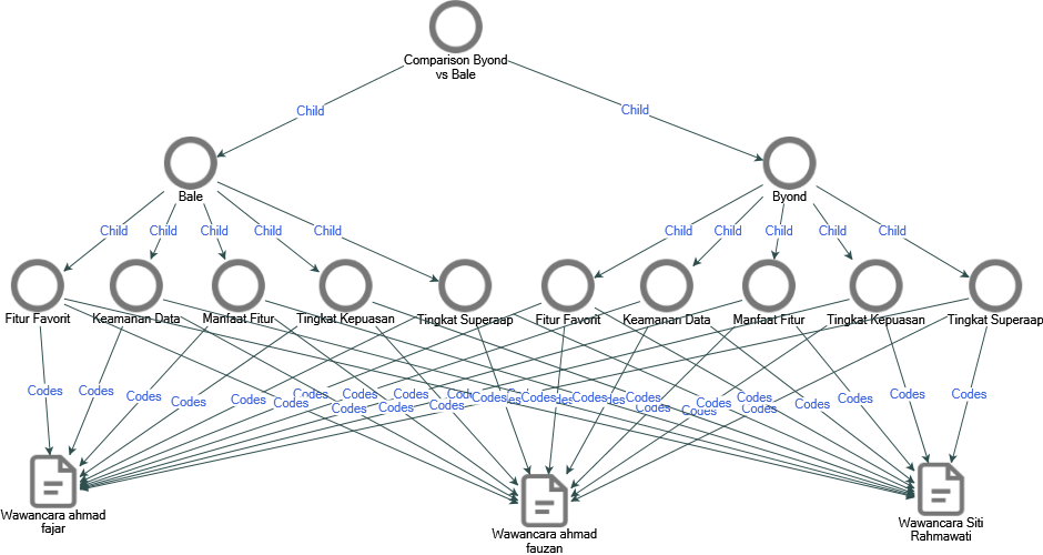 Mobile banking applications are now widely used by the public because they offer features that facilitate transactions. The image shows the results of a comparative analysis between BYOND by BSI and Bale by BTN based on coded interview data. The analysis structure was built systematically through several main categories, namely Favorite Features, Data Security, Feature Benefits, Satisfaction Level, and Superapp Level. Each category was applied to both applications to see the similarities, differences, and advantages perceived by respondents. The image illustrates the comparative analysis structure between the BYOND by BSI and BALE by BTN applications, which was developed through the process of coding interview results. This analysis focuses on five main aspects, namely Favorite Features, Data Security, Feature Benefits, Satisfaction Level, and Superapp Level. Each aspect is analyzed for both applications in order to obtain a clear understanding of the advantages, disadvantages, and user experience in using these digital banking services. The left side of the diagram shows the categories for BALE by BTN, while the right side shows the categories for BYOND by BSI. Each category is linked to codes derived from the statements of three respondents: Ahmad Fajar, Ahmad Fauzan, and Siti Rahmawati.