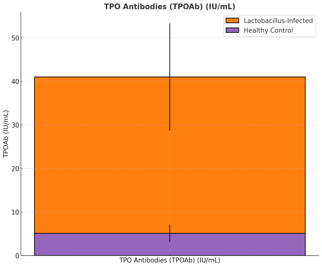 Figure 9. Figure 9: Comparison of TPO Antibodies (TPOAb) (IU/mL) between Lactobacillus-Infected Pregnant Women and Healthy Controls