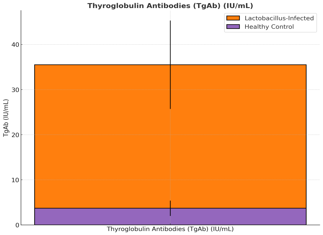 Figure 10. Figure 10: Comparison of Thyroglobulin Antibodies (TgAb) (IU/mL) between Lactobacillus-Infected Pregnant Women and Healthy Controls