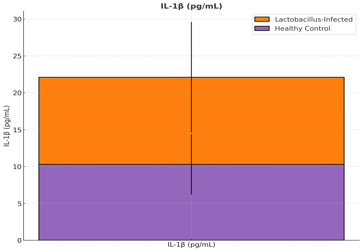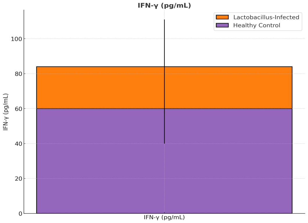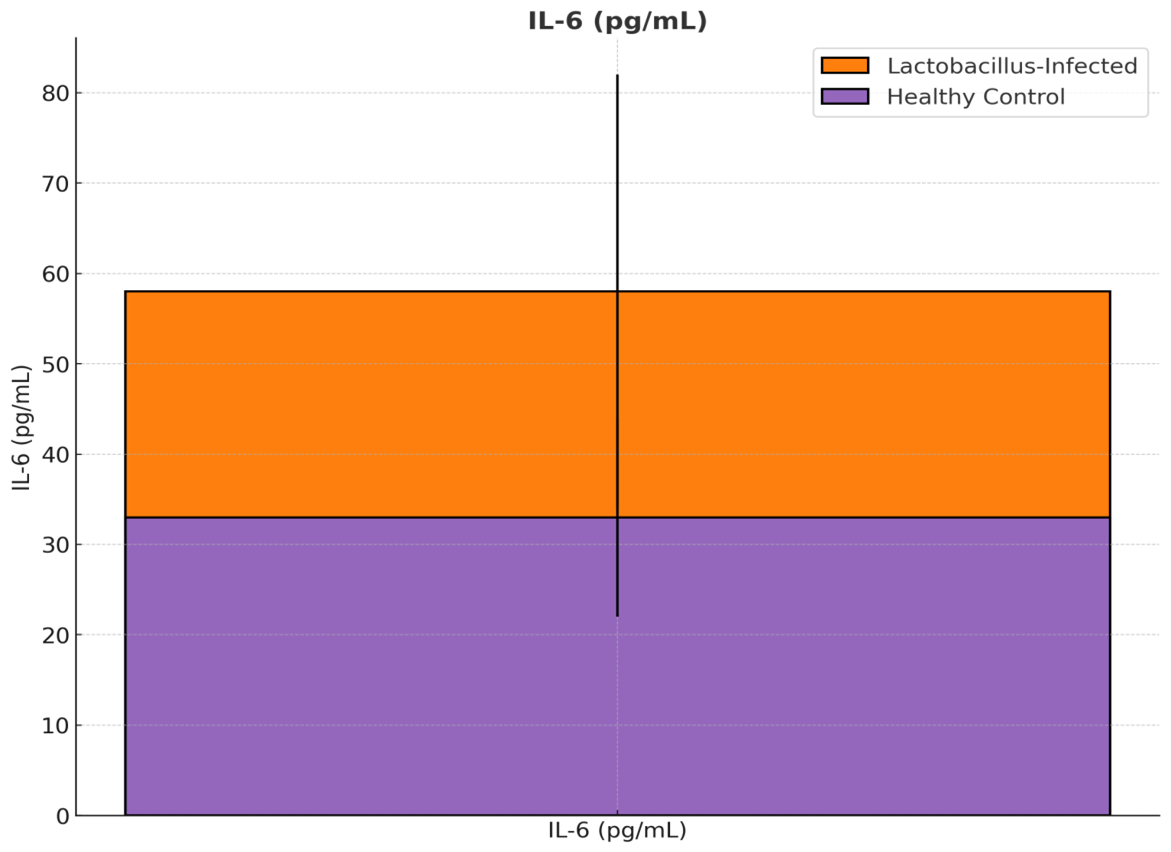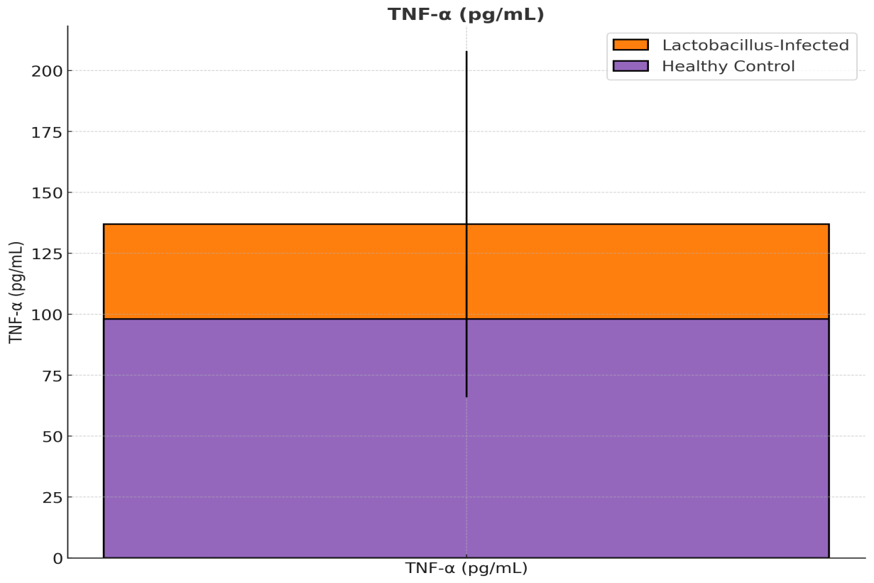 The Lactobacillus-infected group had significantly higher levels of TNF-α (137 ± 71 pg/mL) compared to the healthy control group (98 ± 22 pg/mL), p = 0.045, indicating a pro-inflammatory milieu.Figure 15 compares the levels of the proinflammatory cytokine tumor necrosis factor-α (TNF-α), which aligns with our inflammatory findings in the infected group.