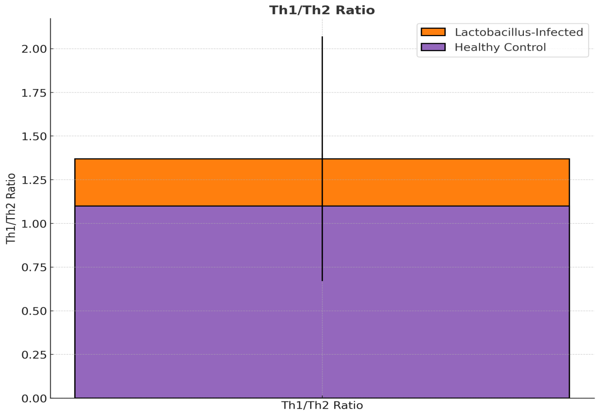 The Th1/Th2 ratio was significantly higher in the Lactobacillus-infected group (1.37 ± 0.7) compared to the healthy controls (1.10 ± 0.3), with a p-value of 0.04, suggesting a shift toward a Th1-dominant immune response in the infected women.Figure 14 illustrates the difference in Th1/Th2 ratio, demonstrating the immune imbalance favoring the Th1 response in the Lactobacillus-infected group.