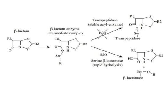 In the presence of β-lactam antibiotics, however, the β-lactam ring is mistakenly recognized by the transpeptidase enzyme as the D-alanyl-D-alanine substrate. As a result, the enzyme forms a covalent bond with the β-lactam molecule instead. Because no adjacent amino group is available and water is excluded, the enzyme remains trapped in an inactive acyl-enzyme complex [12].