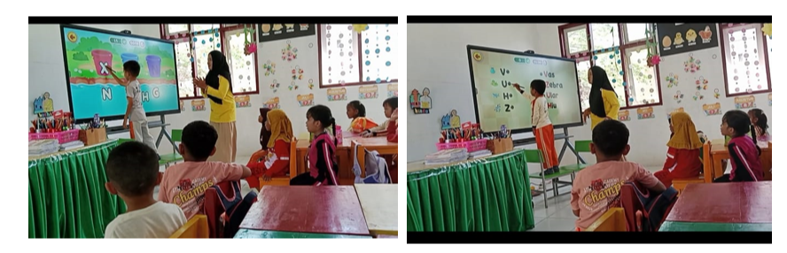 Based on the observations that have been made, integrated coding learning using an Interactive Flat Panel (IFP) shows that children are very enthusiastic. They follow certain steps displayed on the screen, such as selecting blocks, arranging them in the correct order, and pressing the start button, so the elements of algorithms or sequencing begin to appear in their actions. In this case, the teacher uses the IFP to display coding challenges that are visually rich, such as games that match pictures with letters or numbers, as well as character movement paths, while guiding the children to solve the given problems. Through prompting questions and direct demonstrations on the screen, the teacher helps students recognize patterns (such as directional patterns or object sequences), choose the correct steps, and reflect on mistakes to correct them later.