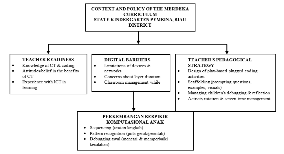 Diagram of findings relationships This diagram can be visualized as a flow model: Context & Policy → (Teacher Readiness + Digital Barriers) → Teacher's Pedagogical Strategies → Children's CT Development,