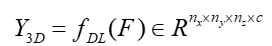 3D Deep Learning Modeling for full 3D spatial prediction, a deep neural network f DL maps multimodal features F to a 3D property cube Y 3D: