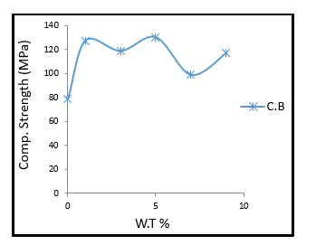 Figure (5) shows the relationship between compression strength and reinforcement ratios (0,1,3,5,7,9) The results showed that the compressive strength of the composite recorded the highest compressive strength of the epoxy-black carbon composite at 5%, which indicates that in this ratio, we have obtained the best adhesion and cohesion of the interface between the base material and the reinforcing material ;The compression durability increases with the durability of the interface [12, 13].