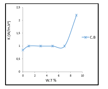 Figure (7) shows the relationship between the coefficient of thermal conductivity and the reinforcement ratios (0,1,3,5,7,9) and the results showed that the thermal conductivity coefficient recorded values that increase with the increase of the reinforcement ratios and the highest value was at 9% This indicates that an increase in the percentage of added minutes leads to an increase in the likelihood of thermal conductivity due to an increase in the amount of the material (additive), which has a higher conductivity than the base material, which in turn leads to an increase in thermal conductivity [15, 16].