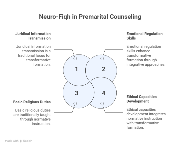 Within premarital counseling, a Neuro-Fiqh framework emphasizes the cultivation of emotional self-regulation, moral awareness, and relational competence as prerequisites for marital responsibility. For example, Islamic legal principles that mandate kindness, patience, and non-harm resonate strongly with neuroscientific findings on the role of emotional regulation and stress management in sustaining healthy relationships [14]. By integrating these perspectives, premarital counseling can evolve from a rule-centered instructional model into a formative process that develops ethical dispositions grounded in both revelation and empirical understanding.