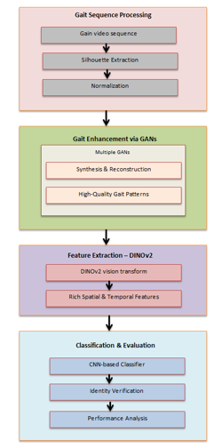 The first of the four primary parts of the suggested framework is the following: (1) One part of the processing for gait sequences is the standardization of gait silhouettes extracted from video clips. utilizing adversarial generative networks (GANs) to improve gait by generating and reconstructing high-quality gait patterns utilizing numerous GAN architectures is the second challenge. Using the DINOv2 vision adaptor, the third step involves the extraction of dense spatial and temporal characteristics. (4) Classifying and assessing while using a convolutional neural network (CNN) classifier with full performance analysis. This is accomplished via the process of identification verification. See Figure 1 for a diagram of the system that is being suggested.