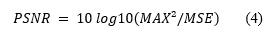 where MAX is maximum pixel value and MSE is mean squared error.