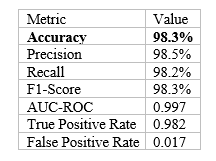 The area under the curve (AUC) is 0.997, and the ROC curve reveals almost flawless discriminating capacity. A rapid increase at the outset suggests a genuine positive rate higher than 95% and a false positive rate lower than 2%. At the chosen resolution threshold, the operational point is FPR = 1.7% and TPR = 98.2%. A greater true positive rate corresponds to a higher throughput setting, whereas a lower false positive rate corresponds to a higher security setting.
