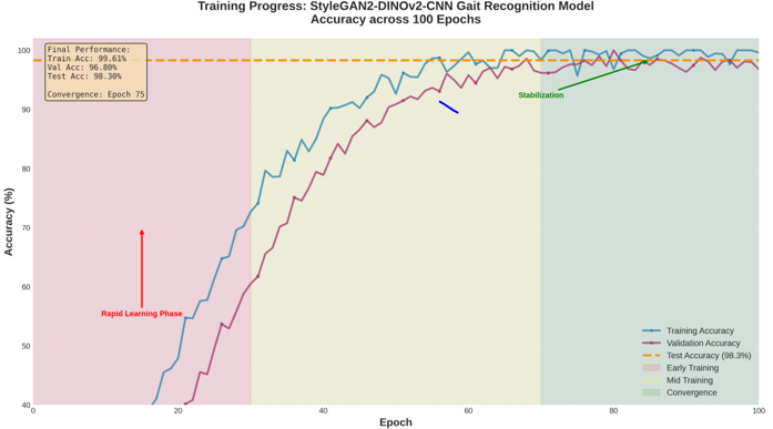 There is a blue line for training accuracy, a purple line for validation accuracy, and an orange dashed line at 98.3% for final test accuracy. These are the three training stages that stand out: early training (epochs 1–30, shown in red), mid-training (epochs 30–70, shown in yellow), and convergence (epochs 70–100, shown in green). A stable performance is reached by the model by epoch 75.