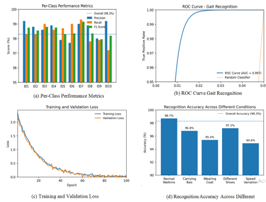 Figure 7. All-inclusive evaluation of classifier performance, including: (a) class accuracy, recall, and F1 score for 10 sample identities, showing balanced performance across all metrics; (b) the ROC curve, showing near-perfect discrimination with an AUC of 0.997; (c) the training and validation loss curves, showing smooth convergence without over-allocation; and (d) recognition accuracy across various walking conditions, showing the model's resilience against different factors. Detailed Analysis of Subplots: