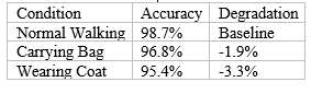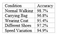 3. Wearing a coat (95.4%) showed the largest decrease in accuracy due to appearance (3.3%). Body shape and limb movements are obscured, making gait analysis more difficult. However, accuracy above 95% remains acceptable for most applications.