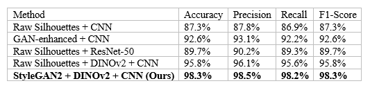 Table 3 compares the proposed StyleGAN2-DINOv2-CNN framework with alternative feature extraction and classification approaches[28]. see table 5.