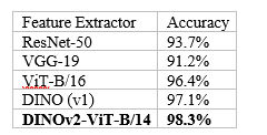 DINOv2 outperforms other extractors due to: - Self-supervised pre-training on diverse data - better generalization without fine-tuning - Rich semantic features capturing both local and global patterns