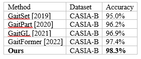 Figure 23. Table 10 compares our framework with recent gait recognition methods: