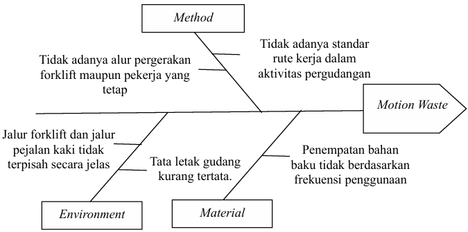 Belum terdapat prosedur pemindahan bahan baku dan reservasi lokasi penyimpanan sebelum kedatangan barang, tidak tersedia sistem informasi lokasi stok (WMS) yang mampu menampilkan ketersediaan lokasi secara real-time (langsung), dan penandaan area penyimpanan dan kavling belum jelas serta tidak terstandarisasi. Sehingga menyebabkan pemborosan waktu pencarian. Selanjutnya terdapat diagram tulang ikan untuk pemborosan pergerakan tidak perlu yang dapat dilihat pada gambar 4.