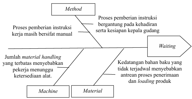 Terjadi perangkapan fungsi di mana pekerja gudang juga bertugas sebagai operator forklift dan administrasi bahan baku, keterbatasan alat bantu material handling menyebabkan pekerja tidak dimanfaatkan secara optimal, serta area gudang yang sempit dan kurang tertata membatasi pekerja untuk bekerja secara simultan.. Sehingga menyebabkan pemborosan pemanfaatan pekerja kurang optimal. Selanjutnya terdapat pemborosan menunggu yang dapat dilihat pada gambar 8.