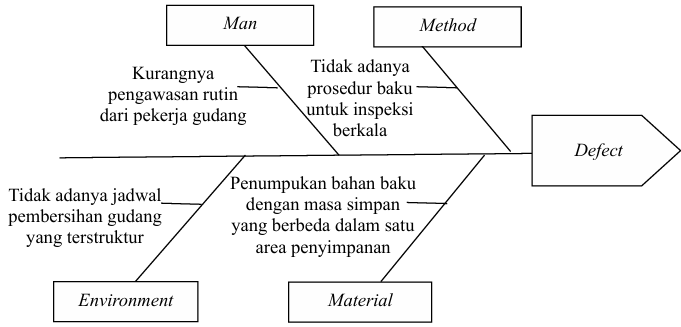 Penumpukan bahan baku dengan masa simpan yang berbeda dalam satu area penyimpanan, kurangnya pengawasan rutin dari pekerja gudang terhadap kondisi fisik bahan baku yang telah lama tersimpan, tidak adanya prosedur baku untuk inspeksi berkala terhadap kualitas bahan baku di area penyimpanan, serta tidak adanya jadwal pembersihan gudang yang terstruktur. Sehingga menyebabkan pemborosan kerusakan.