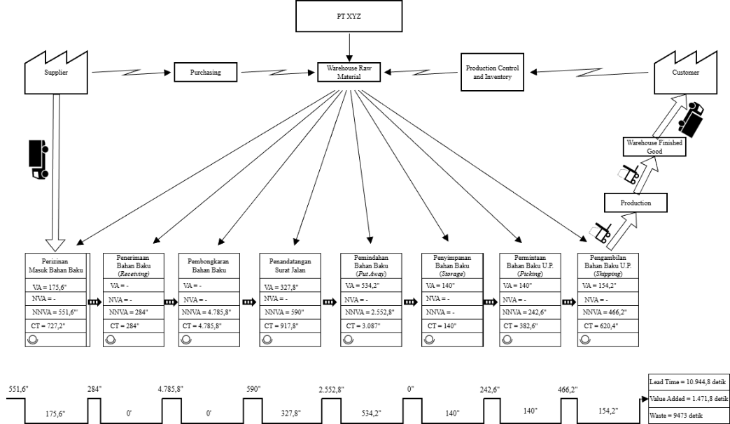 Pemodelan dengan Big Picture Mapping Awal dilakukan agar dapat diketahui aliran material dan informasi di gudang bahan baku PT XYZ, sehingga diperoleh Process Cycle Efficiency (PCE). PCE ini nantinya menjadi dasar untuk mengidentifikasi adanya pemborosan dalam proses [12].