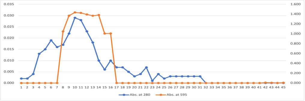 An experiment was conducted to purify the toxin produced by bacteria using the ion exchange purification technique, where the toxin was purified via a DEAE-cellulose column. After several washings, the result was the purification of the toxin at a concentration of 1,036.5 mg/mL, as measured using a spectrophotometer at a wavelength of 595 nm, as shown in Table 4-10. The optical density during purification peaked at a wavelength of 595 nm, ranging between 7 and 16, specifically peaking at 10. For the peaks at a wavelength of 280 nm, the range was between washing 8 and 16, with the highest peaks also at 10, indicating similar concentration heights of the peaks in these purifications, as illustrated in Figure 4-18, which shows the peaks throughout the purification of the toxin produced by E. coli O157:H7.