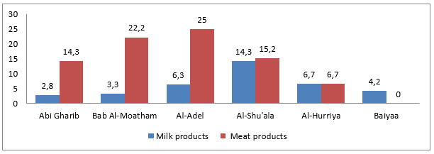 The highest percentages of bacterial contamination with E. coli were found in samples collected from Al-Adel district, with 25% for meat and 0% for milk. The highest percentage of contamination was in Al-Shu'ala district, with 14.3% for milk and 2.8% for milk in Abu Ghraib district. It is worth noting that the samples were collected randomly from markets in different areas of Baghdad. The reason for this may be due to the lack of hygiene in the slaughterhouses in these different areas during the slaughter process and the contamination of the carcass with waste and contaminated entrails, as bacteria from contaminated meat can be transferred to meat cutting equipment, thereby contaminating the meat,