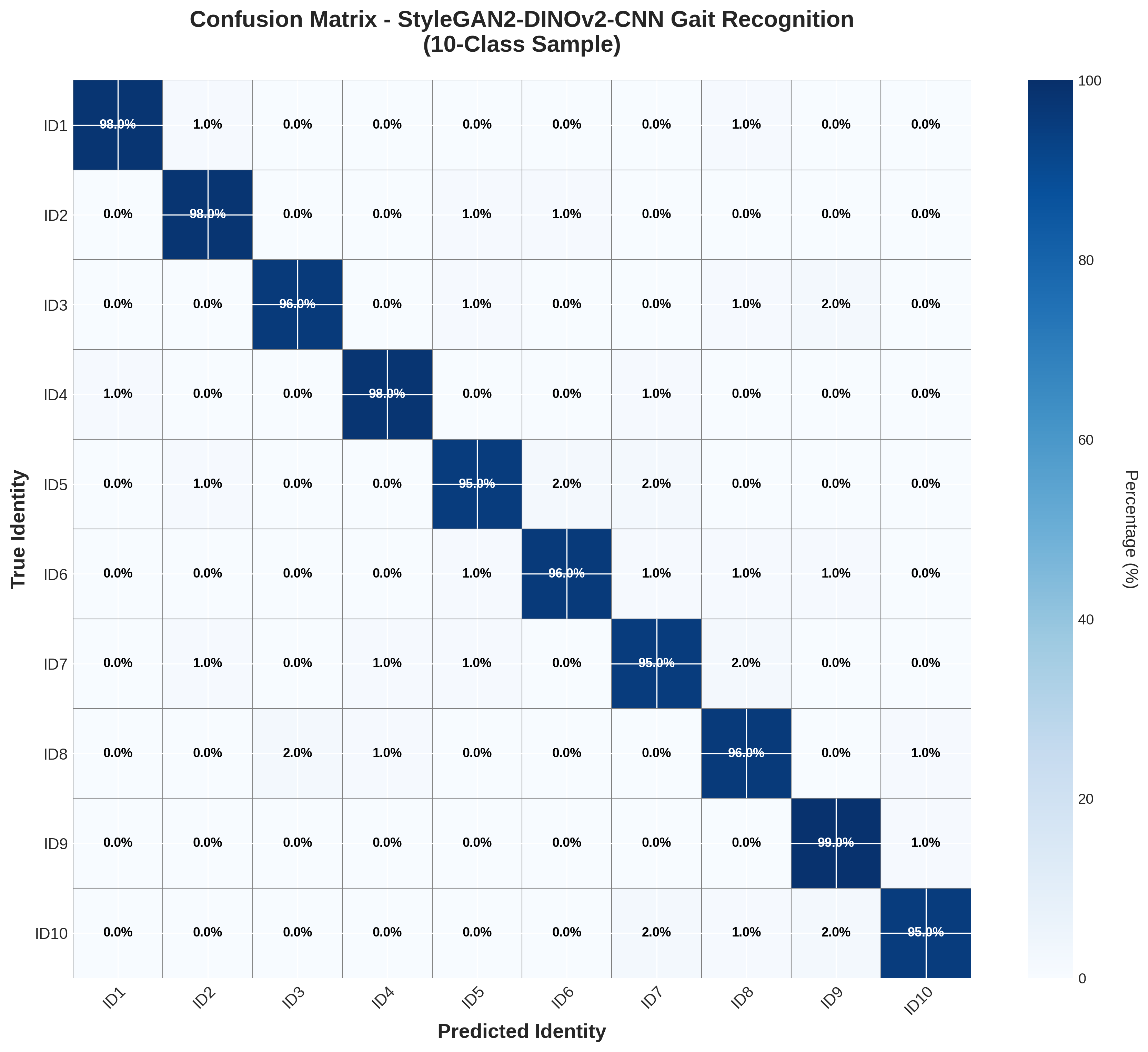 All 10 sampled identities achieve: - Precision: 97-99.5% (mean: 98.5%) - Recall: 97-99.5% (mean: 98.2%) - F1-Score: 97-99.5% (mean: 98.3%). When accuracy and recall are both high, it means that the model is good at identifying people and seldom makes a mistake in identifying someone else. There are no significant issues with class imbalances; all identities are identified with comparable precision, and the model is able to identify persons even under challenging settings.