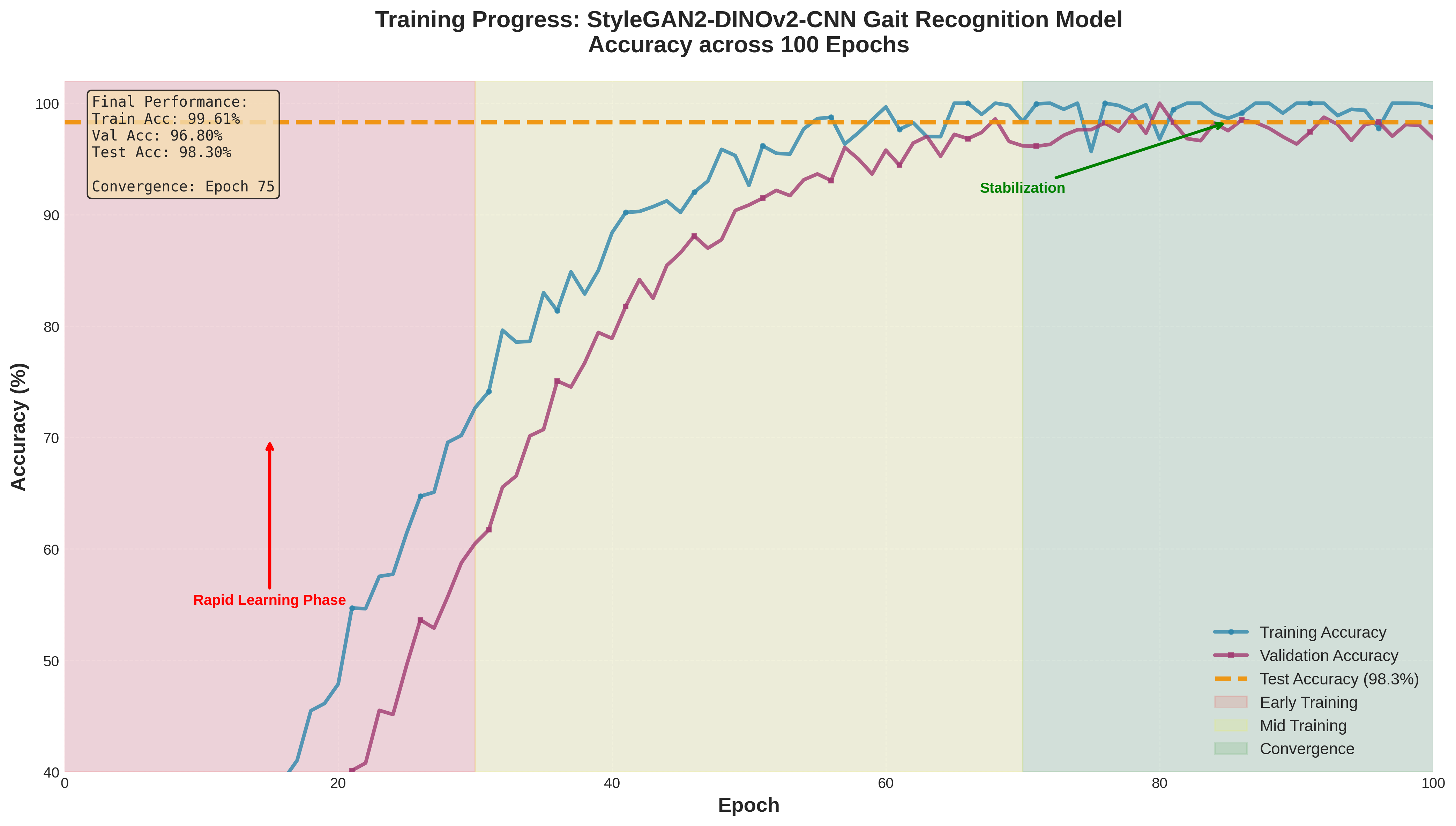 The extracted features are fed into a convolutional neural network (CNN) classifier to learn discriminatory patterns between different identities. The system utilizes the retrieved gait pattern to identify or verify the person when it is necessary. Finally, commonly used measures to evaluate system performance include recall, accuracy, precision, and F1-score. The last stage and the final output of the system are shown in Figure 1. To accomplish gait recognition, the proposed system integrates preparatory work, generative optimization using GANs, and deep feature extraction using DINOv2[24].. This is why gait detection systems function better and are more robust in the real world.