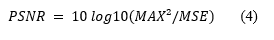 where MAX is maximum pixel value and MSE is mean squared error.