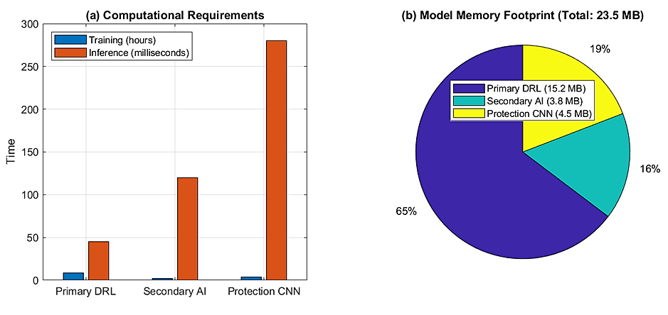 The computational analysis determines that it is feasible to implement it in real-time. The 14.3 hours of total training are minimal compared to inference time (280 ms maximum protection CNN, 165 ms execution of the control loop). The overall memory footprint of 23.5 MB can be handled by the current hardware. These indicators justify the fact that the computational load does not affect the real-time functionality demands of the MTDC systems.