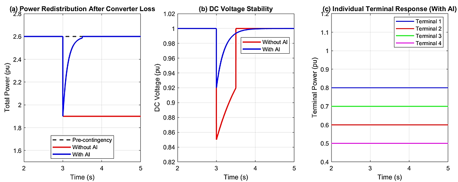 - Case 4: N -1 Contingency (Converter Loss). Disconnection of one of the important VSC terminals (e.g., an onshore inverter) suddenly is modeled. System survivability is a binary metric that means that DC voltage is within a stable range ( pu). The efficiency of re-dispatch using power is measured as a percentage of the power loss that is actually recovered by the other terminals over a given period Tdispatch: : .