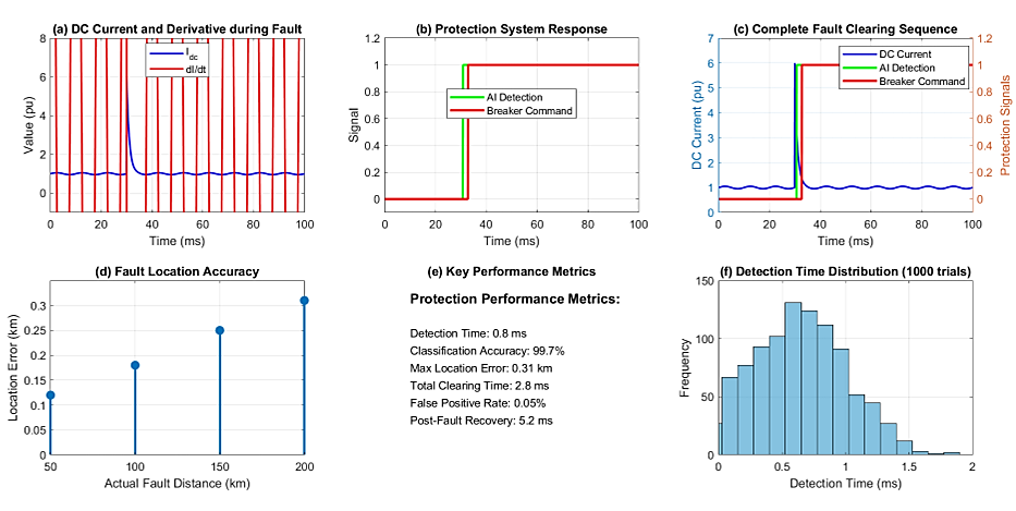 - Case 3: DC Side Faults. This case study is a critical evaluation of the protection scheme. The most important metrics are: Fault Detection Time (minutes after the fault was generated till the CNN output has changed), Classification (fraction of correct classifications), Fault Location Error , , Total Fault Clearing Time Tclear (minutes since the fault was generated till the breaker has been opened), and the Post-Fault Recovery Time which is the amount of time it takes the grid to regain normal operation after the break.