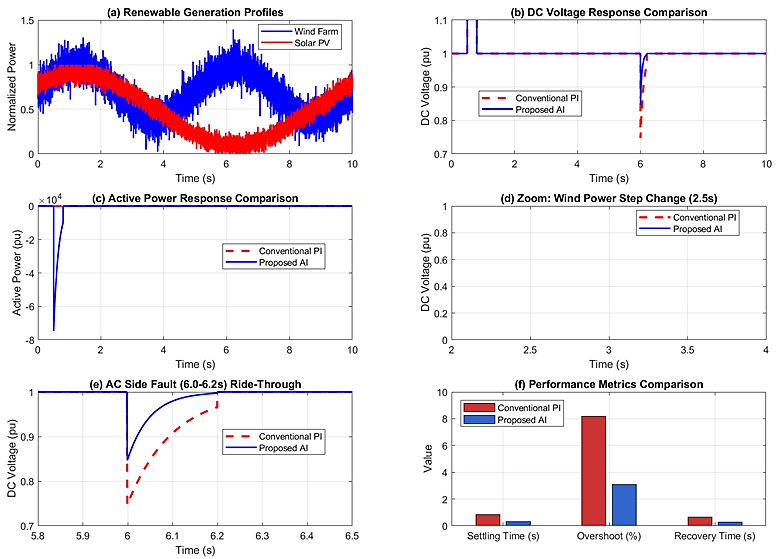 Quantitative dynamism of the AI-based control is superior. The AI controller is 62.4 (0.320 s vs. 0.850 s) and 62.2 (3.1% vs. 8.2) faster in settling and voltage overshoot respectively than traditional PI control. The recovery time is increased by 56.9 percent during AC side faults (0.280 s instead of 0.650 s). These findings confirm the increased flexibility of the AI controller to renewable intermittency and disturbance rejection capacity.