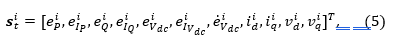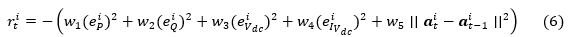 where , , and are the errors in the instantaneous active power, reactive power and DC voltage, respectively. is the integration of these errors and is the derivative. The action is the vector of modulation indices of the dq-axis voltages: .. The reward function rt i is aimed at reducing tracking error and managing effort as (6):