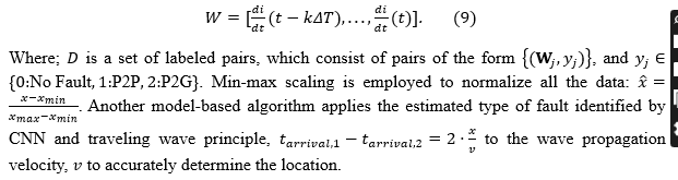 Protection AI Models: In the case of fault protection, a hybrid scheme is created that applies the AI-model. A 1D Convolutional Neural Network (CNN) is meant to detect and classify faults. In order to create its training set, thousands of EMT simulations are generated, injecting pole-to-pole (P2P) and pole-to-ground (P2G) faults at each 10 km along all DC lines. Fault resistance is varied and the inception angle is varied to . In both cases, a data window of raw current derivative signals di/dt at line-ends is obtained as (9):