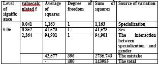 - The F-value of the interaction between gender and specialization also reached (3,183This is less than the tabulated F value of (3.86) This indicates that there are no statistically significant differences in the interaction between gender and specialization. This interaction between gender and specialization indicates that there is no substantial interaction affecting the scientific specialization, given that males in the humanities specialization are no different from males in the scientific specialization, and also that females in the humanities specialization are no different from females in the scientific specialization in terms of the concept of self-conviction.
