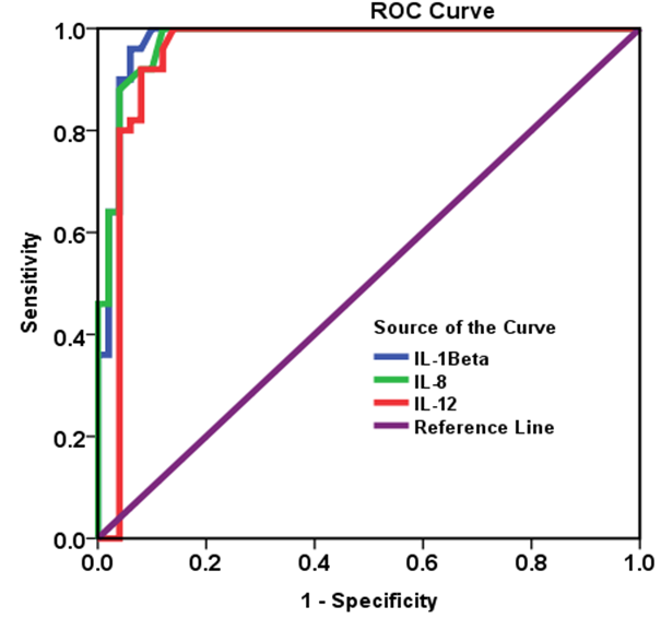 Figure 4: (Blue curve) Receiver operating characteristic curve of IL-1β levels to differentiate Autistic children and healthy control subjects. (Green curve) IL-8 level receiver operating characteristic curve to differentiate Autistic children and healthy control subjects. (Red curve) Receiver operating characteristic curve of the level of IL-12 to differentiate Autistic kids and healthy control subjects.