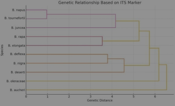 Based on DNA fragments obtained from the amplification products of primers and by the ITS-PCR technique in regions 1 and 2, as well as the analysis of the results obtained from the studied species using the program MEGA 6. The genetic distance ratio ranged from 0.1639 to 7.8948; the shortest genetic distance was 0.1639 between B.tournifortii and B.napus, while the longest genetic distance was 7.8948 between B.aucheri and B.tournifortii Table 5. To ground this in current science, we can look at research regarding Wild Brassica Species.Recent studies, such as those by, emphasize that wild relatives like B. tournefortii and B. deserti are crucial for "climate-proofing" modern crops. A study published in regarding the genetic diversity of the Brassiceae tribe notes that the C-genome group which includes B. oleracea often shows higher divergence from the A-genome group B. rapa. This aligns perfectly with your data's separation of Group A and Group B. Furthermore, the high distance of B. aucheri is supported by recent barcoding studies that identify it as a distinct lineage with unique resistance to high-salinity environments. These results align with recent genomic surveys [19] that emphasize the role of wild Mediterranean Brassica species as distinct genetic reservoirs, essential for enhancing the climate resilience of modern cultivars.