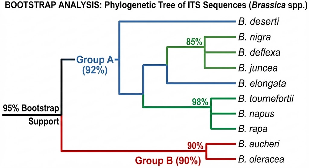 Bootstrap analysis was performed to assess the reliability of the phylogenetic tree constructed from ITS sequences. The results showed high support values for the main clades. Group A, which includes eight species (B. deserti, B. nigra, B. deflexa, B. juncea, B. elongata, B. tournefortii, B. napus, and B. rapa), showed strong support with a bootstrap value of approximately 92%. The closest relationship between B. tournefortii and B. napus showed the highest bootstrap support (98%), confirming their close genetic similarity. A sub-cluster including B. nigra, B. deflexa, and B. juncea was supported by a bootstrap value of approximately 85%. Group B (B. aucheri and B. oleracea) showed strong support (90%), and the separation between Group A and Group B showed very strong support (95%), reflecting significant genetic divergence between the two lineages figure 5.